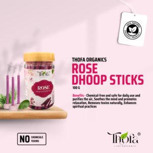 Experience the enchanting fragrance of Thofa Rose Dhoop Sticks, made with the pure essence of roses to bring a peaceful and aromatic atmosphere to your home or spiritual space. These 100g sticks are entirely chemical-free, ensuring safety for daily use. The natural rose aroma not only purifies the air but also helps to remove toxins, leaving your environment fresh and revitalized. Ideal for meditation, prayer, or creating a serene ambiance, these dhoop sticks soothe the mind, alleviate stress, and promote relaxation, while deepening the effects of your spiritual practices.